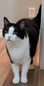Black and white cat, 12-15 lbs, has white chin, mouth, and nose bridge fur surrounded by black fur around eyes and ears. Has white chest, belly, and front legs. Has black back and tail fur. Has pink nose. He loves to hide under (or in) furniture or under blankets. Last seen near MacArthur Place town-homes but may have hitched a ride to 3400 Main St. apartments.