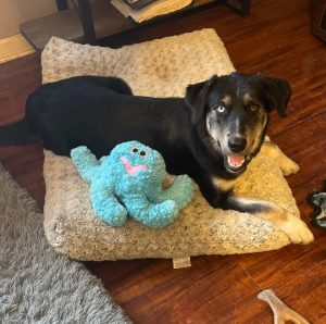 One blue eye one brown. All black with a white belly and at the end of her tail is white. 35lbs female