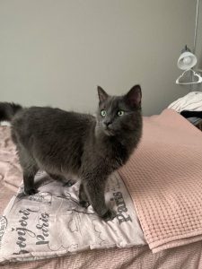 nebelung male silver/gray. he has a pink paw tag and green collar and if found, call his name and have food on hand.