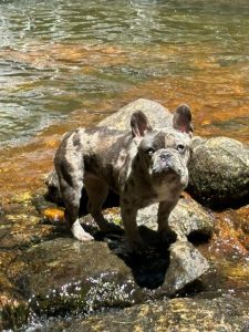 Sunny is a gray merle French Bulldog