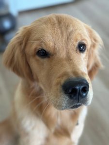 Full grown male golden retriever. About 50-60lbs (he may have lost weight at this point). Fur is more tan than red, though he may appear darker if wet and dirty. Golden retriever cut so bushier in the neck and chest area, long flowing tail. Dark eyes, black circle around eyes, black nose, black mouth. Large front paws. Large head, broad face.