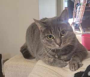 Gray Tabby Cat. With a collar, slightly overweight (when last seen),
