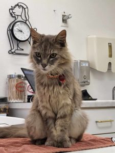 Skinny long haired Maine Coon mix, Abraham. He's skinny due to senior hyperthyroidism and needs medicine twice a day. He's possibly made new friends, but he needs to come home.