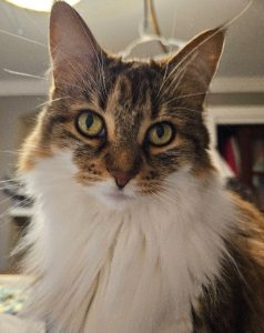 8 year old long haired medium sized cat with green eyes. She has a brown black coat while her chest and paws are white.