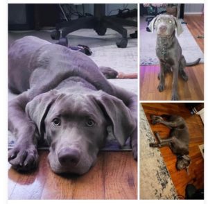 Silver Lab about 85 pounds. Has a tiny white patch on right front leg