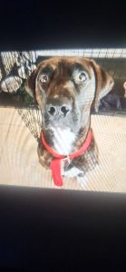 Brindle, big white spot near his chest, big floppy ears, XL dog, brown eyes,