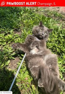 Binky is a medium to large sized cat with long, gray fur and white patches on his chest and tummy.