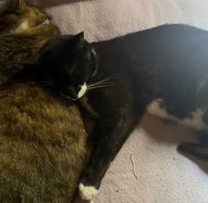Green eyes, skinny/thin, had white accents: on stomach and chest, around mouth (looks like a mustache), on feet (looks like mittens or socks). Has a flea collar but no name tag.