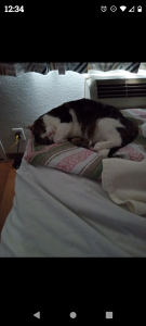 Large Black/White male cat. Black w/brown markings back,tail,ears,head. White mouth,center of nose,neck and stomach.Upper back legs black rest of legs & paws white. Right Front leg black w/brown markings, white paw. Left leg & paw white.