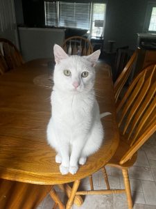 Casper is a white shorthair cat. He is very talkative and sweet, but may be skiddish as he is an indoor cat. He is microchipped and fixed