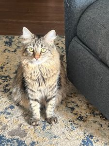 Breed: Long hair tabby Color: Brown black and gray with some white