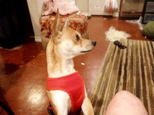 Redish tan short hair rat-chi mix wearing a black harness and a navy shirt that says born and raised in the shape of Texas