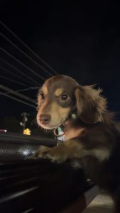 Miniature dachshund color brown, wearing a galaxy collar with his name on a small round tag.