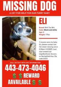 Black and white, 2 YEAR OLD, SHIH TZU MIX, ELI. Underbelly all white. Straight haired ears. Small white patches over each eye.