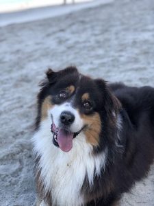 Breed: Australian Shepherd Color: Mostly black black face brown eyes brown spots above eyebrows white chest white snout long hair no tail white paws with a little bit of brown around snout
