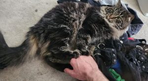 Long hair cat eith bacl fure and gold highlights. Friendly but skittish