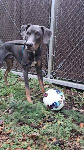 Breed: Doberman mix Color: Blue with fawn coloring he has three white paws and a white spot on his chest