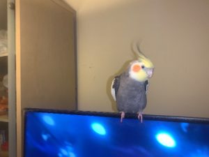 Breed: Cockatiel Color: Gray/yellow head/ orange circles on cheeks