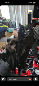 American shorthair with black fur his tail is bushy he is super friendly. Thinks he is a kitty kitty so always wants to play.