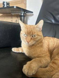 Large male orange cat with black freckles on his nose and a left eye deformation/ skin flap