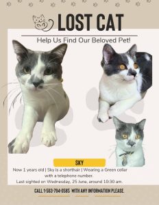 She is white and gray with green eyes. She is very sweet and typically would let anyone pet her/ pick her up, but I know she is extremely scared right now.