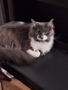 Pretty friendly towards humans but may run away. Can be held for a little bit but will meow or hiss eventually. Very fluffy and beautiful tail she likes to show off. Prefers wet food and loves treats.