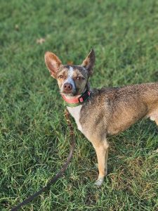 Small chihuahua mix about 11lbs. Skinny with long legs and large ears. Wearing a pink collar and a green collar.