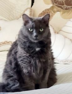 Princess is a medium haired fluffy Blue Russian with a white spot on her upper chect and round yellow-green eyes. She has a scar from the operation when her uterus was removed due to infection. She is usually very sweet and timid though I don't know what she's been through in the past week.