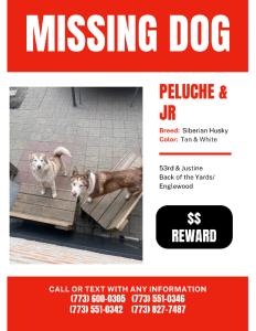 Peluche (tan and white, female) and Junior (dark brown and white, male) are Siberian Husky siblings, almost 2 years old. Both are microchipped, fixed, and due for yearly vaccines. They are very friendly but may be scared if approached by strangers. They have been with our family since birth and are deeply loved. Their parents, Nala and Simba, are waiting for them at home. Please help us bring them back safely.
