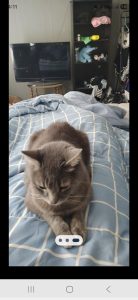 Gray, white chin, green eyes, all gray paws, neutered, very visible scar across upper middle of his tan nose