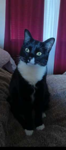 Tuxedo Cat 2 years old male neutered. Distinctive mark on his nose like a triangle a white belly and black back four white paws. Please help bring my Milo home
