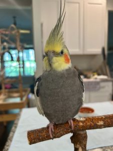 Grey cockatiel with leg band. grey body, yellow head, orange cheeks