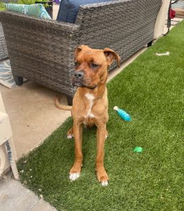 Breed: Boxer mix Color: Reddish brown with white on belly and toes