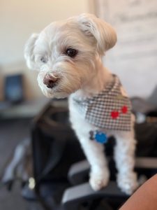 Female senior dog, Maltese breed, pure, white fur, a pink collar with tags she weighs about 7 pounds and is a small breed