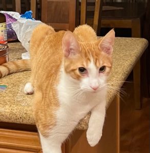 Willy is half orange and half white, he has orange stripes along his body and a striped tail. He’s long and on the thinner side.