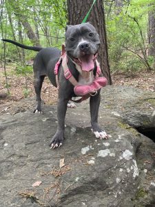 She was wearing a green camo vest with a half chewed leash she broke out of our window while we were at work