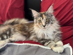 Breed: Maine coon Color: Tortoise B shel, grey, white, orange patch on back of neck, white paws, black nose