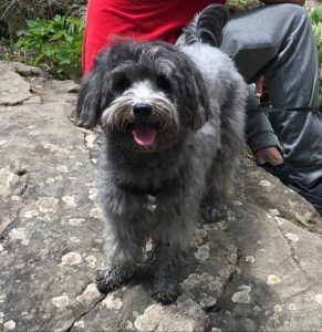 10 year old, Gray poodle mix. Long tail with long hair. Wearing a bandanna around his neck.