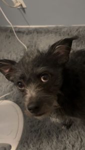 Small, scruffy, mostly black with white on paws and chest wirehaired terrier. Approximately 15lbs to 20lbs.