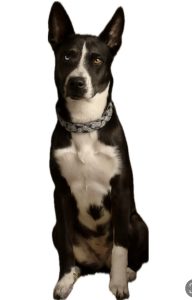 She is a female and is spayed, she is microchipped. Her right eye is partially blue, her primary eye color is brown. She’s smooth coated with a little bit of tickness around the neck and tail. Black with white markings on her belly leading up to her neck and chin. It does not connect to the back only the front of her. White on her paws and on her forehead down and around her nose.