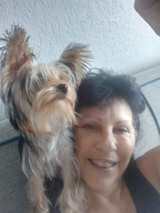 Long haired terrier, mostly white with black on body, white face with hint on brown. Has a collar with a bell on it