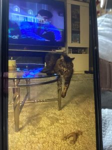 Thick black line down her back. Gingivitis on the top left and right of her mouth. Knots on her belly.