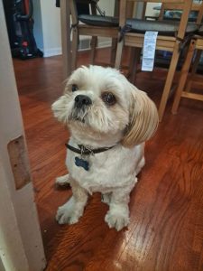 White and tan shih tzu. Friendly and sweet. Loves peanut butter.