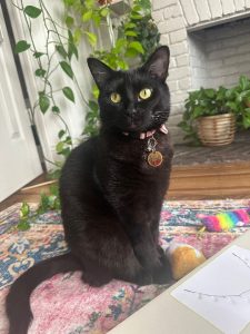 She is black with yellow eyes. She was wearing an orange and black Halloween collar without her tag on it.