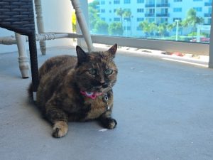 Shy cat, black and brown mixed and green eyes. Wearing a pink collar with a tag on it.