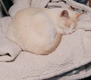 Hermes has blue eyes and is a short haired pale flame point Siamese. He's neutered. He loves playing with other cats. He is friendly with people but may be nervous.