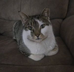Gray and white short hair cat. Scared of strangers but affectionate once he's comfortable