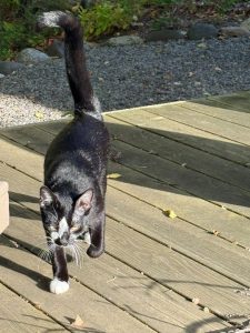 Black and white Tuxedo - 11 months old, friendly, slender with a long tail.