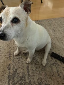 she has no collar.. she’s a little over weight 25-28lbs. she’s all white with faded brown face(aging) and a black bold spot at the end of her tail. she also coughs because of her collapsed trachea