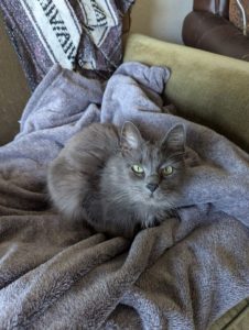 A bit shy but is approachable. Hard of hearing. Has a scar on her nose. Grey. Really nice.